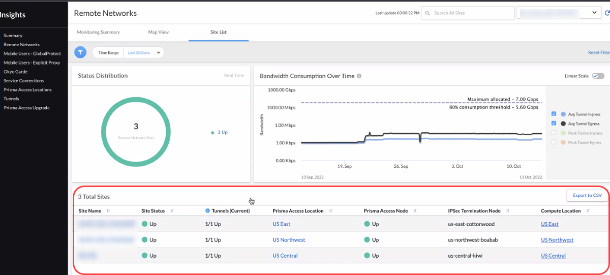 This example shows a total remote network site list of your remote networks' status and metrics for the last 30 days using the rn_list resource.